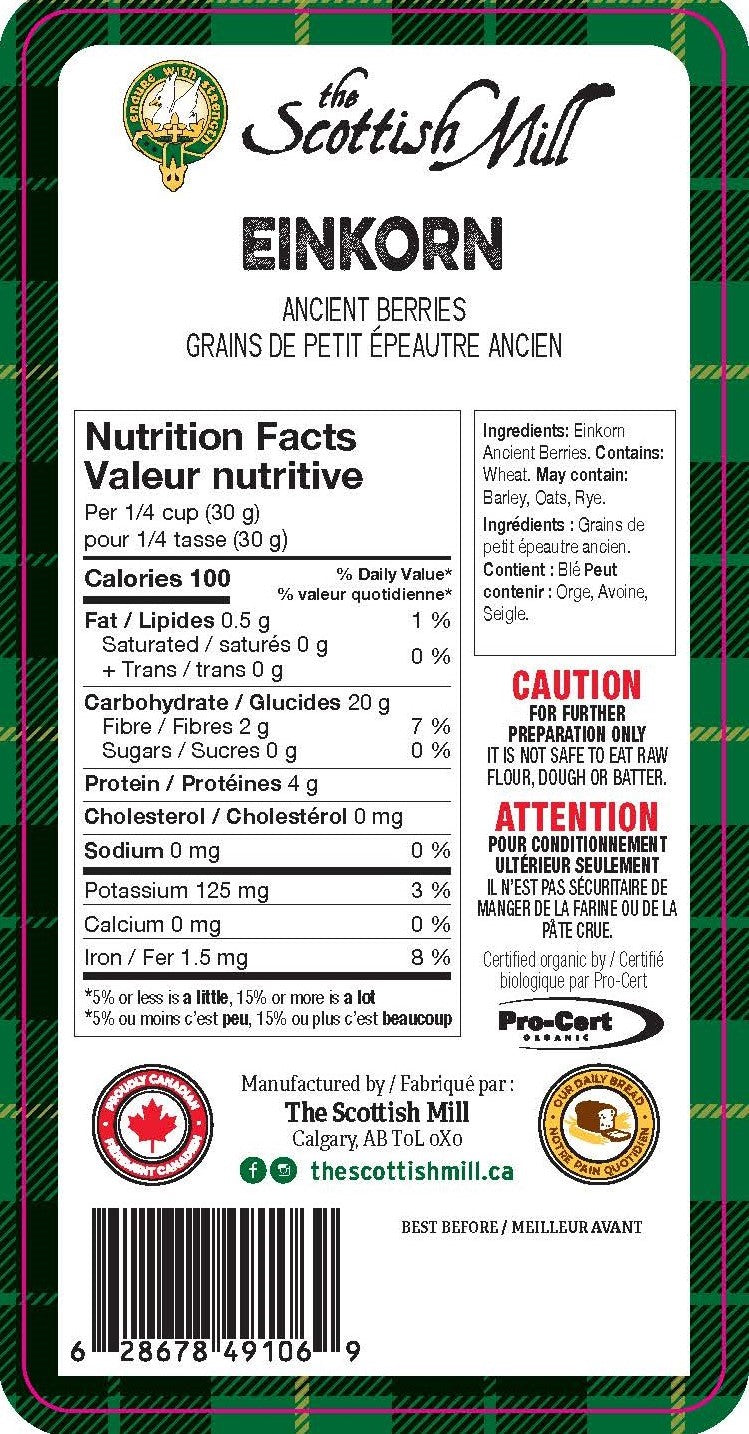 This ancient grain is the earliest known wheat cultivar. Its name means "single grain", and it is the only unhybridized wheat, having 14 chromosomes compared to modern wheat's 42 chromosomes. Many people with gluten sensitivities can comfortably digest einkorn. It has a deep, toasty and nutty flavour and is rich in essential nutrients such as lutein, thiamin, zinc, iron, potassium, riboflavin, Vitamins B6 and A, protein and fibre. Einkorn flour can be used as a direct substitute for other whole wheat flours, and einkorn berries can be used in the place of rice or pot barley.